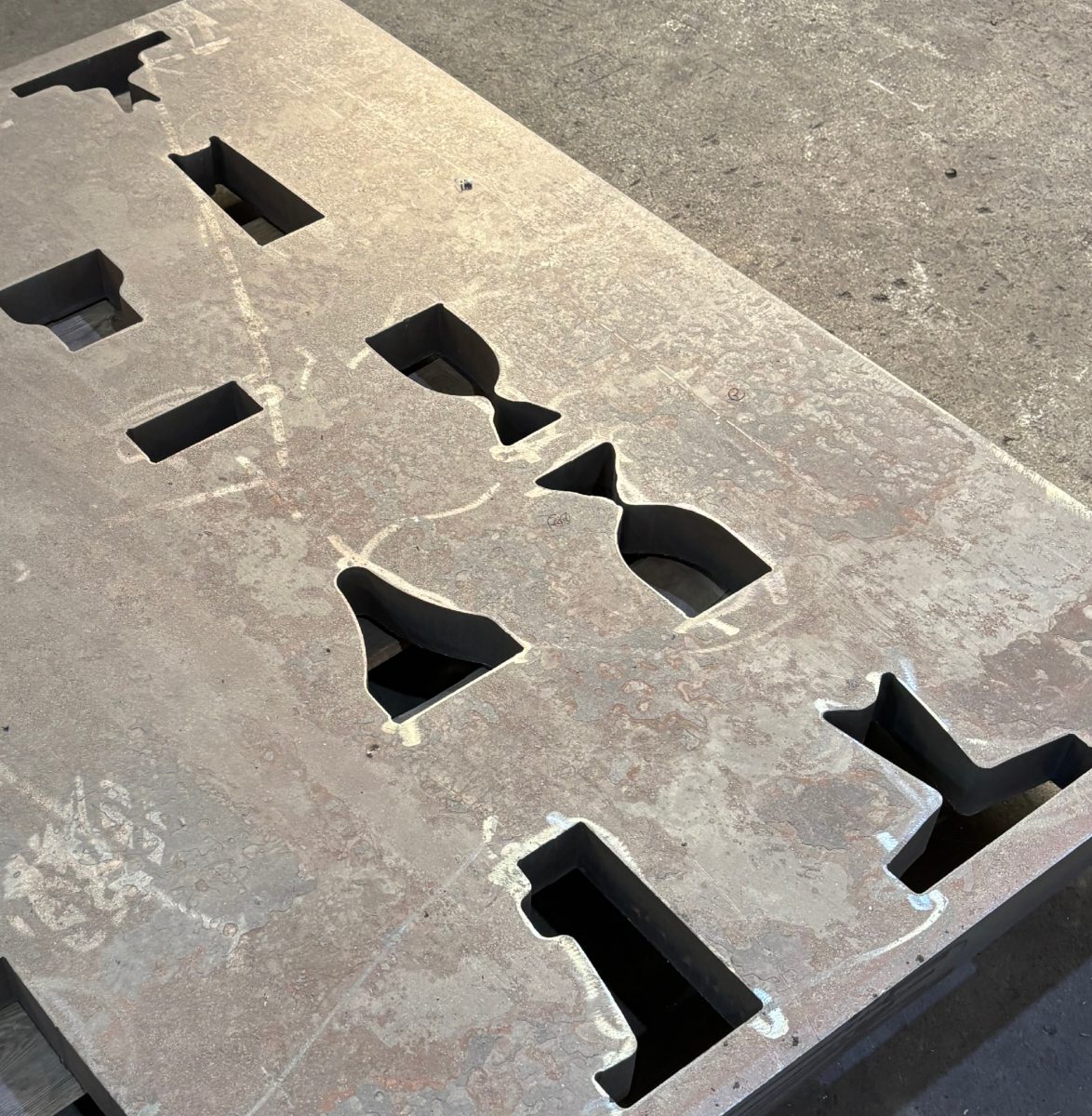 Auf diesem Foto sehen Sie eine Platte für den Stanzwerkzeugbau, die wir aus Baustahl S355J2+N autogen gebrannt haben. Die Stanzplatte wurde anschließend gesandstrahlt, spannungsarm geglüht. Folgend wird diese auf Dicke gefräst und am Bohrwerk bearbeitet. Wir machen uns zur Aufgabe die Wünsche unserer Kunden möglich zu machen.