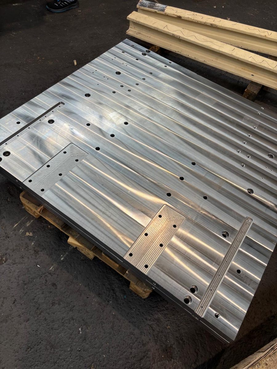 Eine Platte für den Maschinenbau. Größe 2.400 x 710 x 45 mm. Von uns aus S355J2+N gebrannt, spannungsarmgeglüht, gesandstrahlt, auf Dicke gefräst und geschliffen und auf unseren Bohrwerken nach Zeichnung bearbeitet.